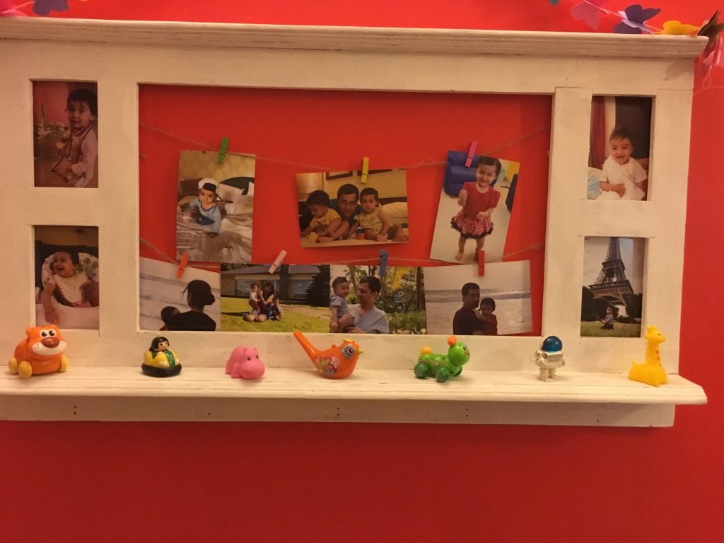 Go Mommy DIY tip: I created a small (no it’s actually quite large) DIY photo frame using a basic wooden frame, a rope string and cute colourful wooden pegs to hold photographs. By adding 4-5 small windup toys, this piece adorns the master wall of our kids’ play room. It’s great to see them looking at their pictures from our family vacations and other memorable times.